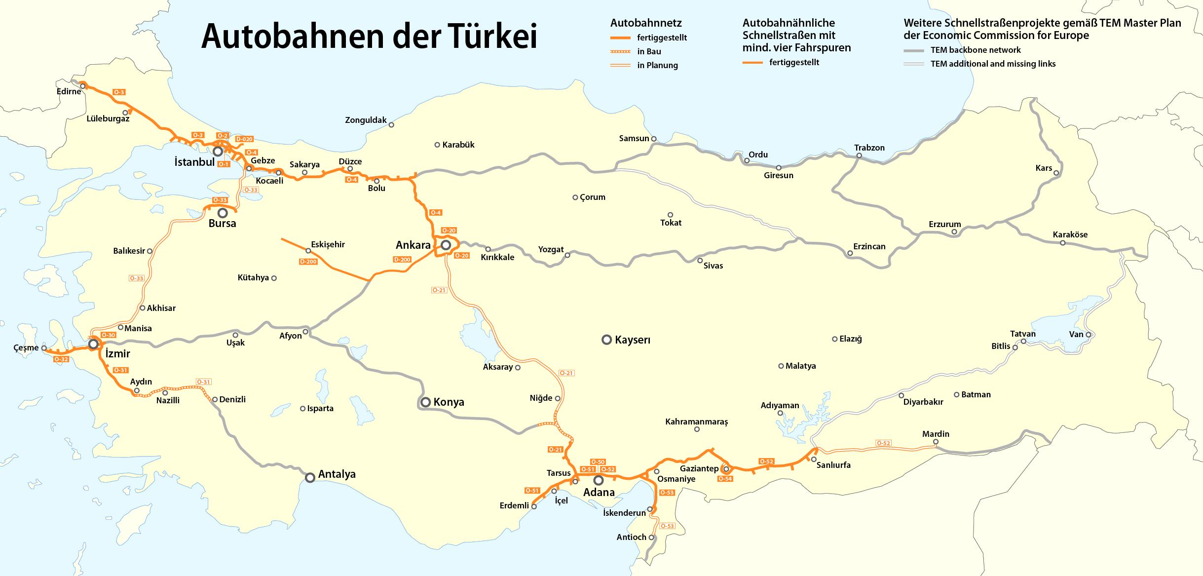 Carte de la Turquie de l'autoroute. La turquie de l'autoroute de la carte (Asie de l'Ouest Asie) à imprimer. La turquie de l'autoroute de la carte (Asie de l'Ouest Asie) à télécharger. En Turquie, les routes nationales sont des routes de première importance qui relient les centres provinciaux, les ports maritimes, les aéroports et les gares ferroviaires entre eux. Les routes provinciales sont des routes d'importance secondaire qui relient entre eux les districts d'une province, le centre provincial, les districts des provinces voisines, les routes nationales, les gares ferroviaires, les ports maritimes et les aéroports. La Direction générale des autoroutes a commencé la mise en œuvre d'un programme de modernisation des autoroutes en 2003, impliquant la transformation des routes à chaussée unique existantes en routes à double chaussée. En 2010, le budget total des autoroutes turques s'élevait à 6,3 milliards d'euros, comme le montre la carte des autoroutes turques. Les autoroutes turques envisagent la réalisation de certains projets autoroutiers par le biais d'un financement PPP d'ici la fin de l'année 2023 afin de répondre à la demande de transport routier de l'économie globale.