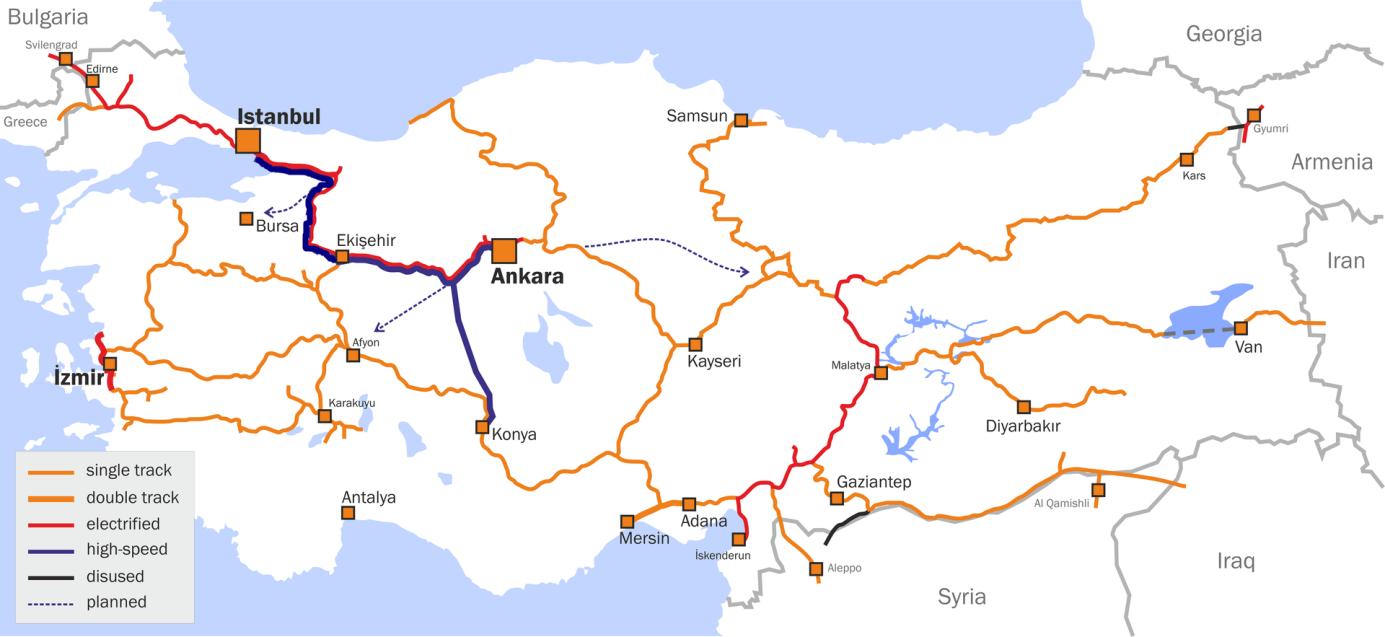 Carte de la Turquie train. Turquie carte du train (Asie de l'Ouest Asie) à imprimer. Turquie carte du train (Asie de l'Ouest Asie) à télécharger. Le réseau ferroviaire turc est géré par les chemins de fer turcs (TCDD ; w tcdd.gov.tr), comme le montre la carte des trains en Turquie. Malheureusement, en raison d'une révision majeure du réseau, il y a actuellement beaucoup d'incertitude quant aux trains qui sont opérationnels. Par exemple, jusqu'à la fin des travaux de la nouvelle ligne à grande vitesse entre Istanbul et Ankara, prévue pour 2015, la seule option pour les voyageurs en train est de prendre le bus jusqu'à Eskişehir, puis le train à grande vitesse jusqu'à Ankara (et vice versa). Le service entre Istanbul et Konya a été annulé, mais il est toujours possible de rejoindre İzmir par le rail en prenant le ferry à grande vitesse de Yenikapı et le 6 Eylül Ekspres sur İzmir depuis Bandirma. Un nouveau service à grande vitesse très utile relie également Ankara à Konya.
