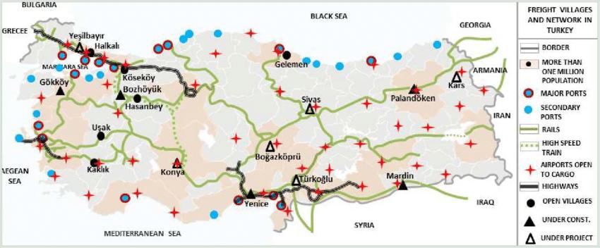 En raison de sa position géographique unique, l'amélioration des transports est une priorité pour le développement économique et social de la Turquie. Ces dernières années, la Turquie a réalisé d'importants investissements et pris des dispositions légales pour améliorer et diversifier ses transports nationaux et internationaux. Le transport aérien est un élément fondamental du tourisme turc, car il constitue le lien vital entre les zones touristiques et les destinations en Turquie, comme le montre la carte des transports en Turquie. En 2010, 68,3 % des étrangers arrivant en Turquie ont préféré le transport aérien comme moyen de transport. À partir des années 1950, le transport routier a connu un développement important et il est aujourd'hui considéré comme le mode de transport dominant en Turquie.